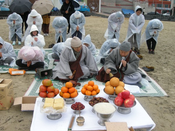 부산송도해수욕장에서 바닷장어 방생법회를 하고있다.